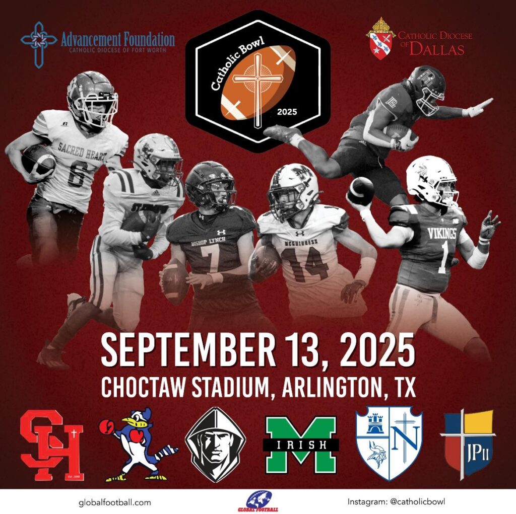 For the fifth consecutive year, the Global Football Foundation, in partnership with the Advancement Foundation of Fort Worth Diocese and the Catholic Diocese of Dallas will present a weekend of Faith, Freedom, and Football. The September 13 triple header at Choctaw Stadium, Arlington Texas will showcase student athletes displaying their talents and teamwork against like-minded Catholic School opponents. As an annual feature before each kickoff everyone at Choctaw Stadium will honor the memory of the 3,000 Americans who lost their lives during the attacks on 9/11 which occurred 24 years ago, before any of these players were born. All six teams will also gather and celebrate their faith with a private Mass on Friday evening.