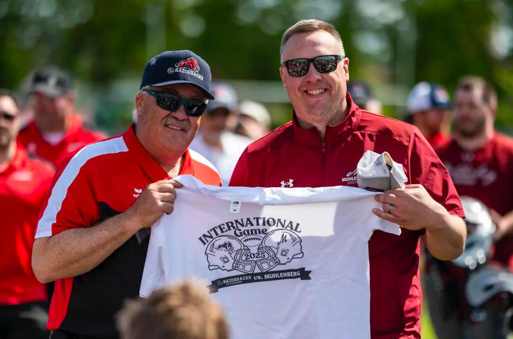 On May 18, 2025, the Muhlenberg Mules delivered a commanding 41-7 victory over the Ravensburg Razorbacks in the Global Ambassadors Bowl at Zeppelin Stadium in Friedrichshafen, Germany. This historic game, the first college football game in the city, showcased the Mules’ NCAA Division III dominance and marked a pivotal moment for American football in Germany. Led by Head Coach Nate Milne, the Mules’ strong defense and cohesive teamwork overwhelmed the German Football League’s Razorbacks, electrifying the crowd and demonstrating the sport’s competitive allure. The host team, the Ravensburg Razorbacks, did an absolutely tremendous job promoting the game. Special thanks to Frank Kienzle, Ronny Rühlemann, John Gilligan, and the countless other individuals that helped to produce such an extraordinary event.