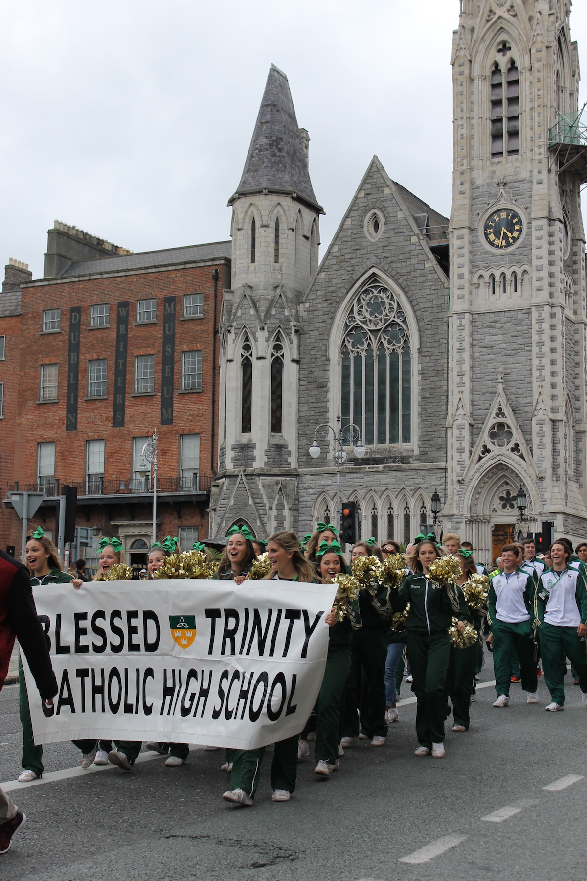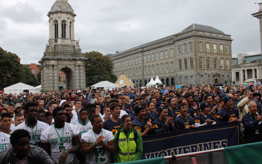The players, coaches and cheerleaders of the six visiting teams closed out their final day on the practice field before they do battle on the gridiron by parading through Dublin City Centre where they were welcomed by thousands of waving and cheering spectators. Led by the marching bands of Georgia Tech and Boston College, the parade wound its way from a busy O’Connell Street to Parliament Square at Trinity College Dublin, where a raucous pep rally officially opened the weekend of Aer Lingus College Football Classic events in Ireland’s capital city.