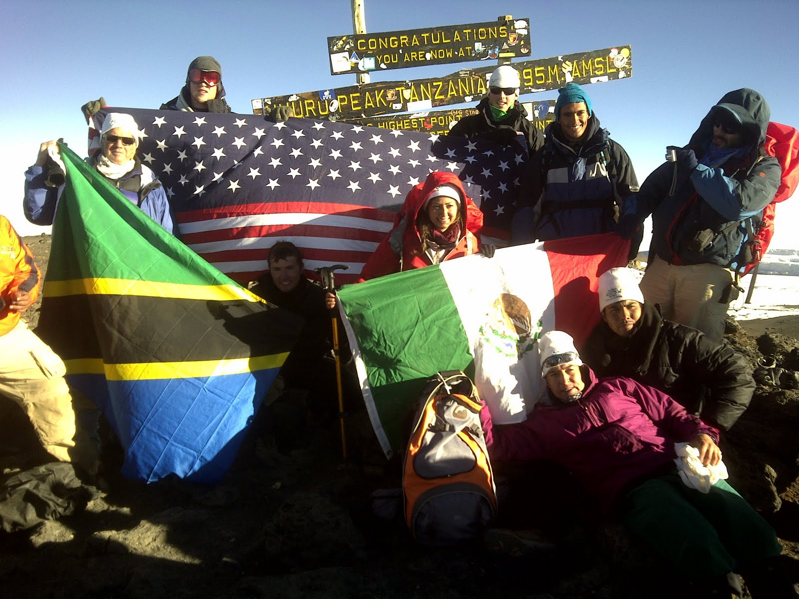 As soon as I reached the summit I proudly pulled from the top of my backpack three prized items that, while extremely light in weight, did bear down on me throughout the five days’ hike. They manifested upon me the burden of knowing I could not fail to bring the national colors of Tanzania, Mexico, and the United States of America to the top of Kilimanjaro. These three symbols stood as the props for everyone’s photos, proudly flapping in the bitter, steady wind rising up from the south face and hurling itself over the rocky summit.
