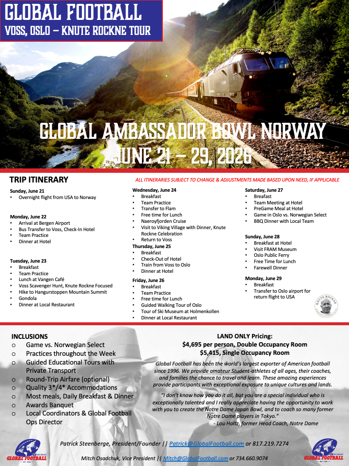 - Compete in the inaugural Global Ambassador Bowl in Oslo against Norway’s top select team