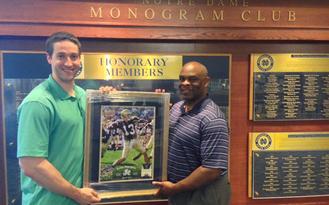 “I started working with the media here in Indiana after my playing days at Notre Dame and my producer (at WSBT Radio) set up an interview with Patrick,” explains Sharpley. “We messaged back and forth a couple of times, talked about shared football experiences at Notre Dame and he talked about what he does.