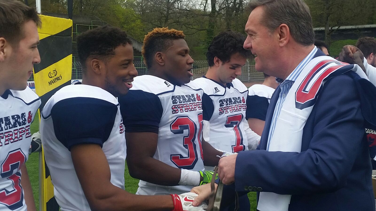 Along with this U19 team there were two squads of younger players who got to watch the big boys play and then take the field themselves; a Hanau Cheerleader squad, a parents-hosted picnic area, loudspeaker music and American officials. The stadium is of a traditional European style with the home side grandstand covered and standing room open air stands on the visitors’ side. It is home to the Hanau Hornets American football club, features football goal posts and a full 100-yard grass turf. Even the Hanau Lord Mayor Claus Kaminsky made and appearance during the second quarter of action, greeting all the US team members, giving them a souvenir and proudly receiving a Stars & Stripes game jersey from Global Football President Patrick Steenberge.