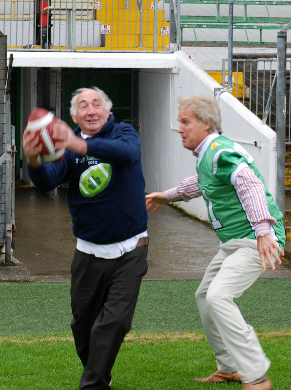 Barney Allen of the local GAA presented Patrick and Regis with game-worn jerseys before the trio threw an American football and kicked a Gaelic football on the hallowed Pairc Tailteann pitch for the benefit of local media.